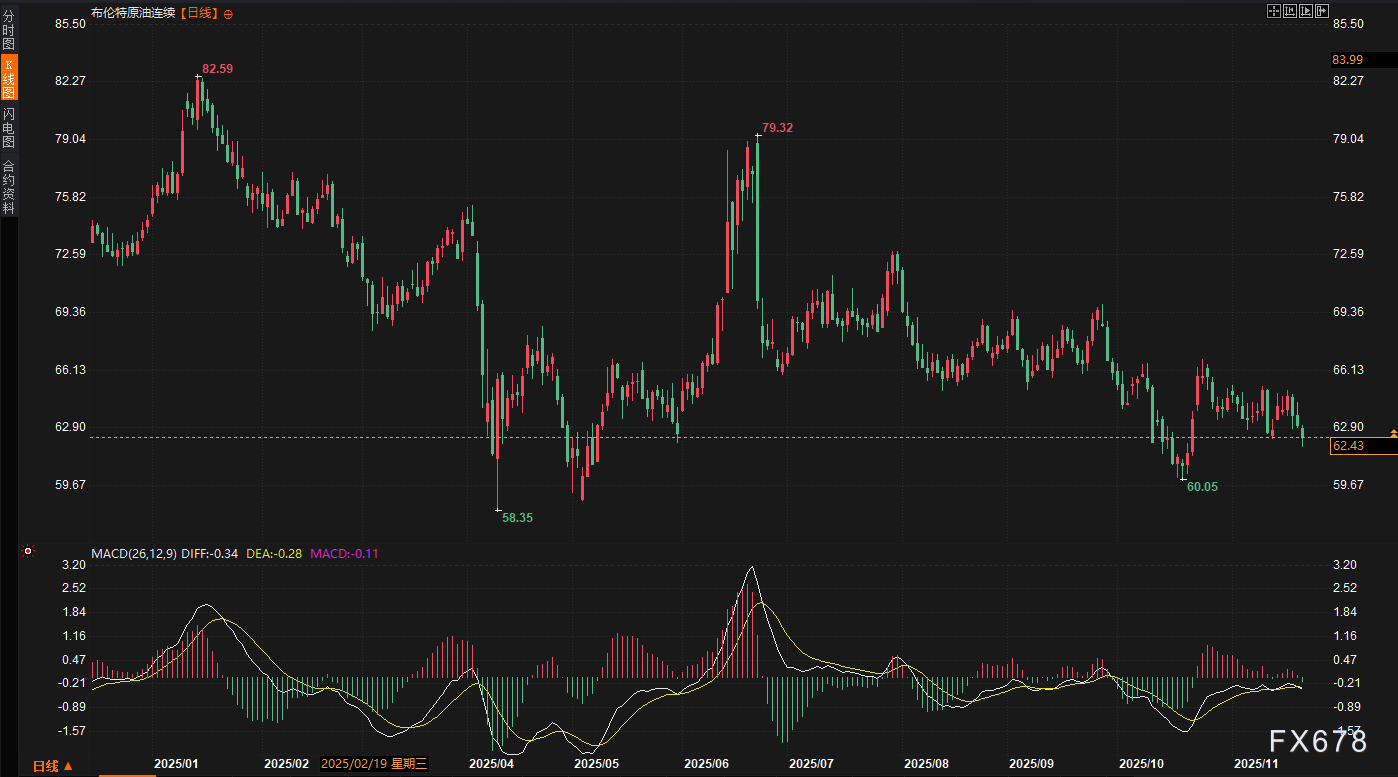 WTI原油(美原油): 截至周五(11月22日)收盘,WTI原油连续合约报收于58.76美元/桶,日内跌幅达到1.73%。从周线级别来看,本周美油累计下跌3.29%。细分到每日走势,空头明显占据了主导地位。除周二市场因技术性修正录得短暂上涨外,其余四个交易日均以阴线报收。周五的下跌尤为关键,一举击穿了此前维持数周的震荡区间下沿,确立了短期的下行趋势。