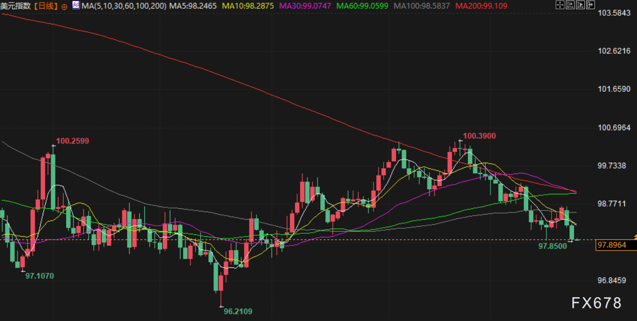 美元指数下跌0.2%,至98.02,预计将创下自2017年以来的最大年度跌幅。Silver Gold Bull的分析师指出,市场预计明年将有更多迹象显示劳动力市场疲软,这可能迫使美联储做出比当前暗示幅度更大的降息让步。